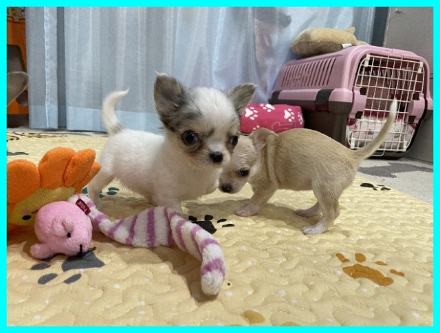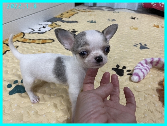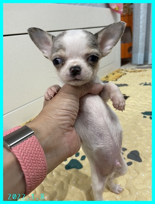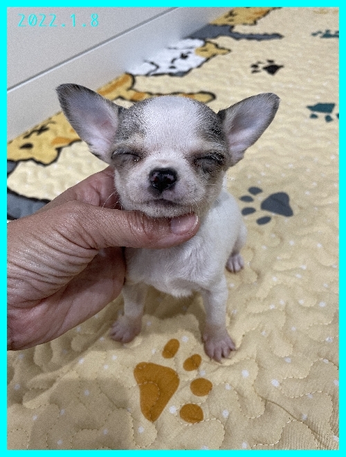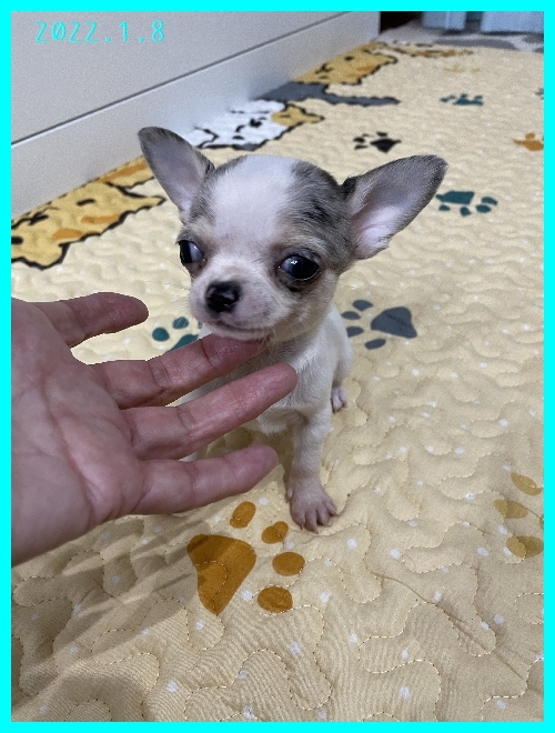 コメント | 両親共に遺伝子検査済みでPRAクリアです。 成犬時2キロくらいの小さなチワワちゃんです。 とってもかわいい子です。 珍しいブルーマール&ホワイトの毛色です。 |
