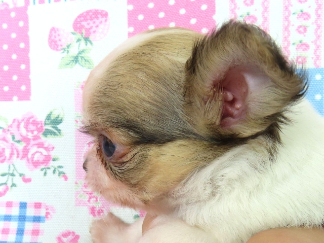 コメント | ※体重などの情報は後日掲載いたします。 モレラがありますが成長ともに塞がることがあるため特に欠点とは考えておりません。 でべそがあります。 子犬と親犬はブリーダー歴30数年、40数年の経験者と動物看護士などが中心に365日、注意深く、丁寧に観察してお世話をしております。 子犬ちゃんは人間同様、個人差がありますので、子犬ちゃんのお世話の仕方、お食事あげ方はご見学時、お迎え時などに担当のスタッフより詳しくお伝えいたしますのでなんでもご遠慮なくご相談ください。 JKCの全犬種審査員資格者と単犬種パピヨン審査員資格者が在舎しておりますので、パピヨンのスタンダードを熟知しております。 当犬舎はパピヨン一筋50年を超える日本で一番歴史のあるパピヨン専門犬舎です。 犬舎号と登録は1970.10/19です。 日本中の国産のパピヨンで当犬舎の血統が入っていない犬は存在しません。 血統書発行団体JKCより下記表彰を受けております。 JKC特別繁殖奨励賞第1位受賞 犬舎 JKCパピヨン犬種表彰受賞 犬舎 ご見学は大歓迎ですのでどうぞご連絡の上、おいでください。365日年中無休です。 2013年9月1日より「動物の愛護と管理に関する法律」の改正によって、「生体販売時の現物確認・対面販売」が義務規定となりましたので、最低一度は直接犬舎までご来舎いただかなくてはなりません。従いまして今までのようにネットで写真、動画をご覧になっただけではご購入ができなくなりました。これはすべてのブリーダー・ペットショップも例外がありませんので、ご理解、ご協力のほど御願い申し上げます。 手続きに時間がかるため海外への輸出はいたしません。 スタッフの取得資格 (社)JKC 全犬種審査員2名(社)JKC 単犬種パピヨン審査員1名 (国) 動物看護師統一認定機構 愛玩動物看護師国家資格取得(社)JKC スチュアート1名(社)JKC A級ハンドラー1名 (社)JKC C級ハンドラー1名(社)日本愛玩動物協会 愛玩動物飼養管理士2級3名 動物の愛護及び管理に関する法律による動物取扱責任者2名 |