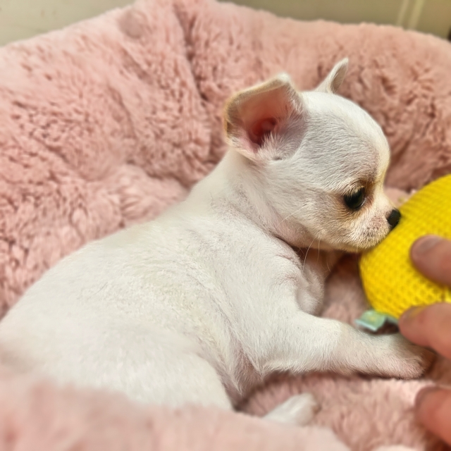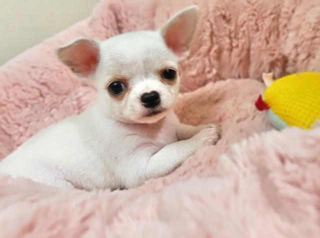 コメント | 9月1日生まれのズコートチワワの男の子。 ふわふわのピンクベッドがよく似合う、優しい瞳の小さな王子様です。 【カラー】 ホワイト&クリーム、耳と背中の一部にクリーム色が入り、それ以外は現在ほぼ真っ白。清潔感のある印象を与えます。 【性格】 人見知りせず、誰にでも優しく接することができる穏やかな性格。 初めての方にもすぐに慣れてくれる、安心感のある子です。 掃除機や乾燥機の音にも物怖じしません 【しつけ】 ・メッシュトイレに慣れています(環境が変わると間違えることもあります) ・カリカリフードも問題なく食べています ・お留守番もできます 【ペコ】 あずき程度の大きさで、健康面も安心です。 きっとこの子の優しさと美しさが、きっと新しいご家族の心を温かく包み込んでくれると思います。 また、LINEでのビデオ見学も承っております |